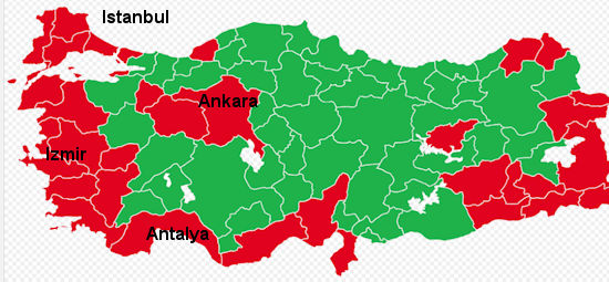 Ces cartes montrent qu'entre 2010 et 2017 les zones acquises au président Erdogan, ont reculées dans le Kurdistan (à l'Est) et que le président a perdu la province d'Istanbul et d'Ankara. La Turquie d'Erdogan est bien l'Anatolie intérieure, la façade autour de la mer Égée, les zones touristiques près d'Antalya, la Turquie d'Europe lui sont traditionnellement hostile.