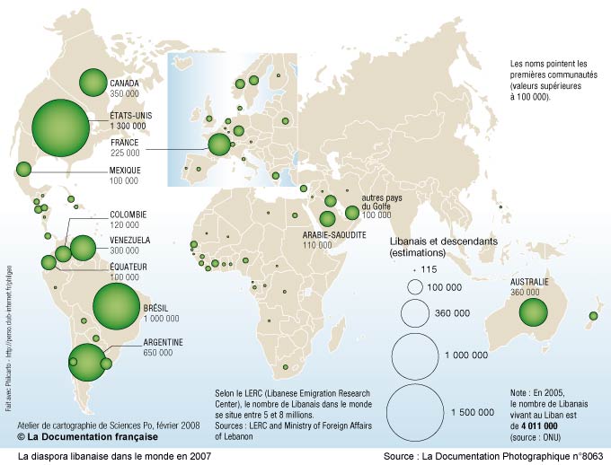 Diaspora, et poids des chrétiens Aujourd'hui, le Liban est loin du puissant empire antique qui a fondé Carthage près de Tunis, c'est un des plus petits pays du Proche Orient, à peine trois millions et demi d'habitants, mais une diaspora deux fois plus nombreuse. Soit une population un peu plus faible que la population juive, mais avec une diaspora relativement plus importante.
