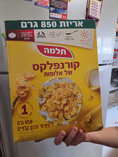 Sur le paquet, il est clairement écrit en hébreu : "Corn-flakes pour les championnes" et dans le rayon, je n'ai trouvé que des corn-flakes pour les champions ! ! sauf dans un gros pack tout enveloppé de plastique. Alors j'ai commencé à le défaire... quand je me suis rendu compte, qu'il avait écrit champion sur le recto, et championne sur le verso du même paquet ! !