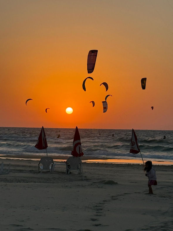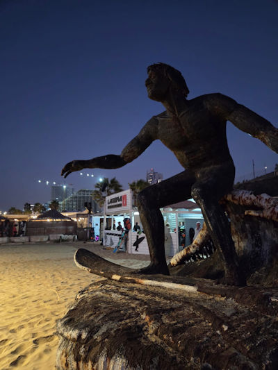 Nous avons fait la course avec le soleil, pour arriver un soir à Bath Yam, avant la nuit qui tombe très tôt et à une vitesse impressionnante. J'avais amené mon maillot de bain, et effectivement l'eau était très bonne... mais... il y avait plein de vent et de superbes vagues qui masquaient le courant. La Méditerranée ici ressemble un peu à la côte landaise, alors je me suis contenté d'admirer le spectacle.