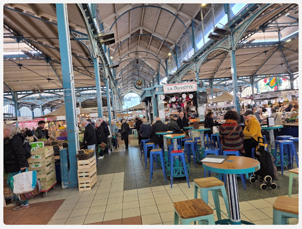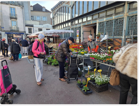 ➔ Sur Dijon, nous avons au centre ville un marché très important, où on trouve un grand hall type Baltar à Paris, et tout autour, comme à l'intérieur, il reste des maraîchers qui proposent les fruits et légumes de leurs exploitations, des distributeurs de fruits et légumes qui sont souvent d'origine nord africaine. A côté il y a surtout à l'intérieur des halles, des poissonniers, charcutiers, bouchers, fromagers etc... Un peu plus loin des halles, les marchands d'habits, de bric à brac porte monnaie, drapeaux, coquilles pour téléphones portables, ustensile de cuisines etc... attirent la clientèle et dans des rues adjacentes,plus loin on trouve des brocanteurs avec toutes les merveilles du monde.