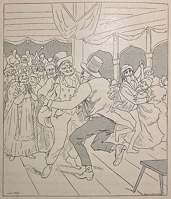 « Un bal termina la fête, le grand père Ohrenstein et le grand père Jadassoon devinrent gai à leur tour. et comme de leur temps chez le juifs pieux, les hommes ne dansaient qu'avec des hommes, et les femmes avec des femmes, les vieux valsèrent ensemble aux rires et aux applaudissements de tous »