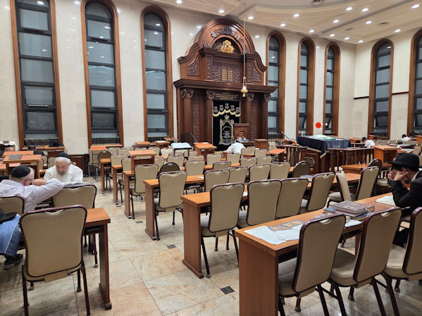 En dehors des offices, la synagogue sert aussi de maison d'étude, où des fidèles de tous âges viennent consulter et réfléchir, seuls ou en groupe. Vous remarquez au fond, l'armoire monumentale où sont rangés les parchemins de la Torah (5 livres de Moïse). J'ai ajouté un point rouge, pour vous montrer l'endroit où l'officiant mène la prière, on devine une grande table oblique sur une estrade.