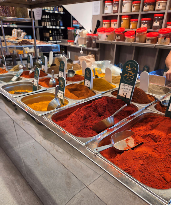Les épices sont du Ras el Hanout, ingrédients traditionnels de la cuisine marocaine. J'ai remarqué le choix de la calligraphie cursive de l'hébreu, qui tend à imiter l'écriture arabe. Quand le marchand m'a vu, il m'a accosté directement en français, disons que je ne ressemblais pas aux hommes en noir qui peuplent la ville, et il m'a pris pour un nouvel émigrant, donc un futur client, et avec une gentillesse toute commerciale, il m'a aussitôt offert un petit verre de whisky.
