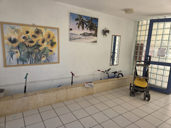 Dans le hall d'entrée, on a mis des tableaux, un miroir, et les trottinettes ou vélos d'enfant ont remplacé les landaus, et poussettes.