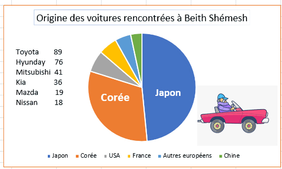 De ma formation d'économiste j'ai gardé un goût immodéré pour les statistiques, et j'en fais sur n'importe quoi quand je me promène. Ainsi, j'ai compté les voitures par marques lors de balades en ville, et j'en ai rencontré plus de 300 en deux jours. Manifestement, les asiatiques dominent le marché. Les chinois avec la marque Chery commence à arriver. J'ai lu un article disant que l'état-major de l'armée avait ordonné à tous les officiers de Tsahal de se débarrasser de leurs voitures Chery, marque chinoise, qui seraient équipées clandestinement de dispositifs permettant de les télécommander à distance ! Côté français, Renault et Citroën ont été vus 8 fois et Sköda trône avec 10 autos.