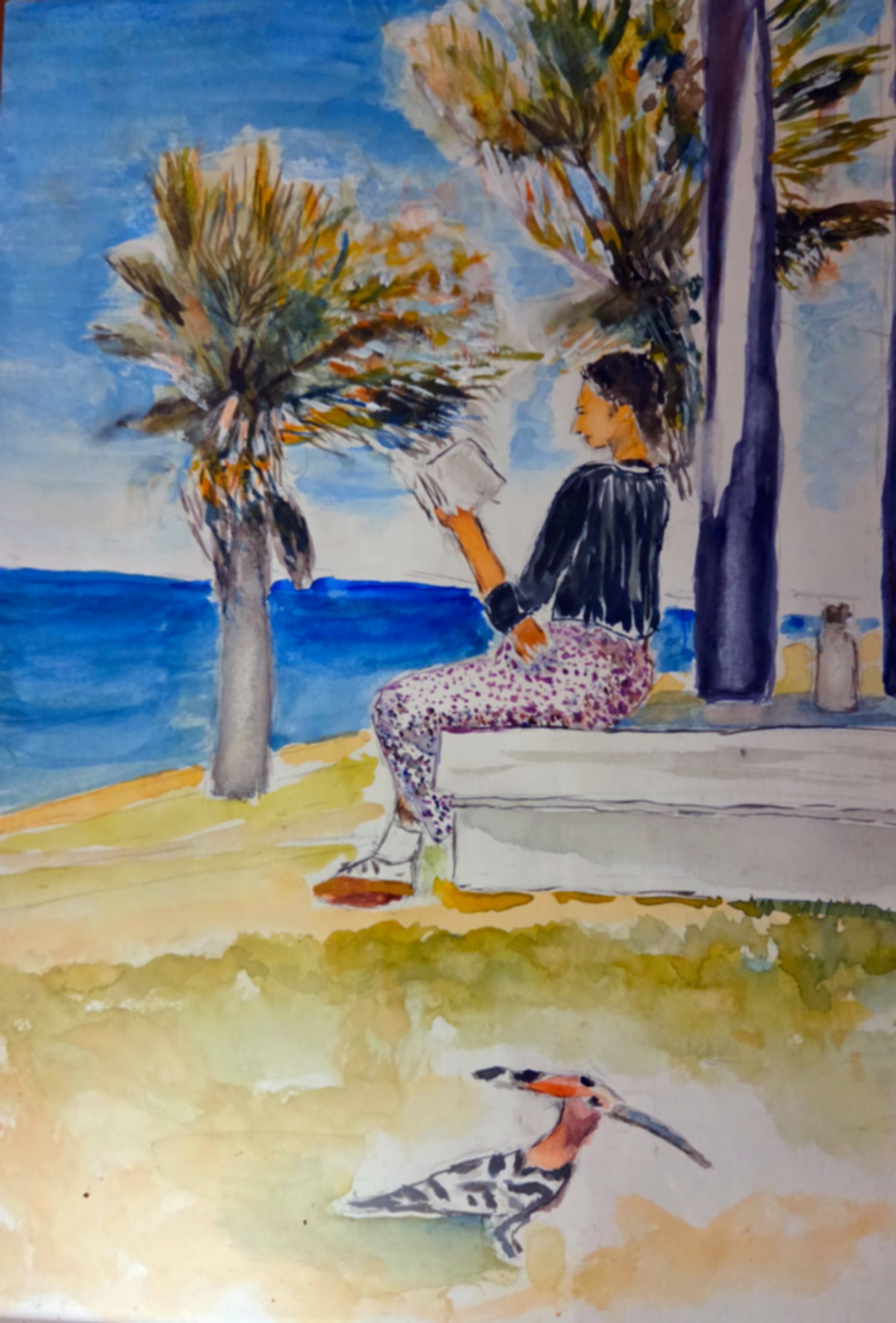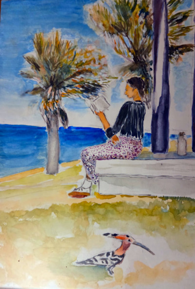 Au cours d'une promenade à Ashkelone, au sud d'Israël, j'ai étée impressionné par le sérieux d'une jeune lectrice face à la mer. Preuve que la scène se passe bien en Israël, on voit la bouteille d'eau derrière la demoiselle ! l'oiseau en bas a été élu « fétiche du pays ».